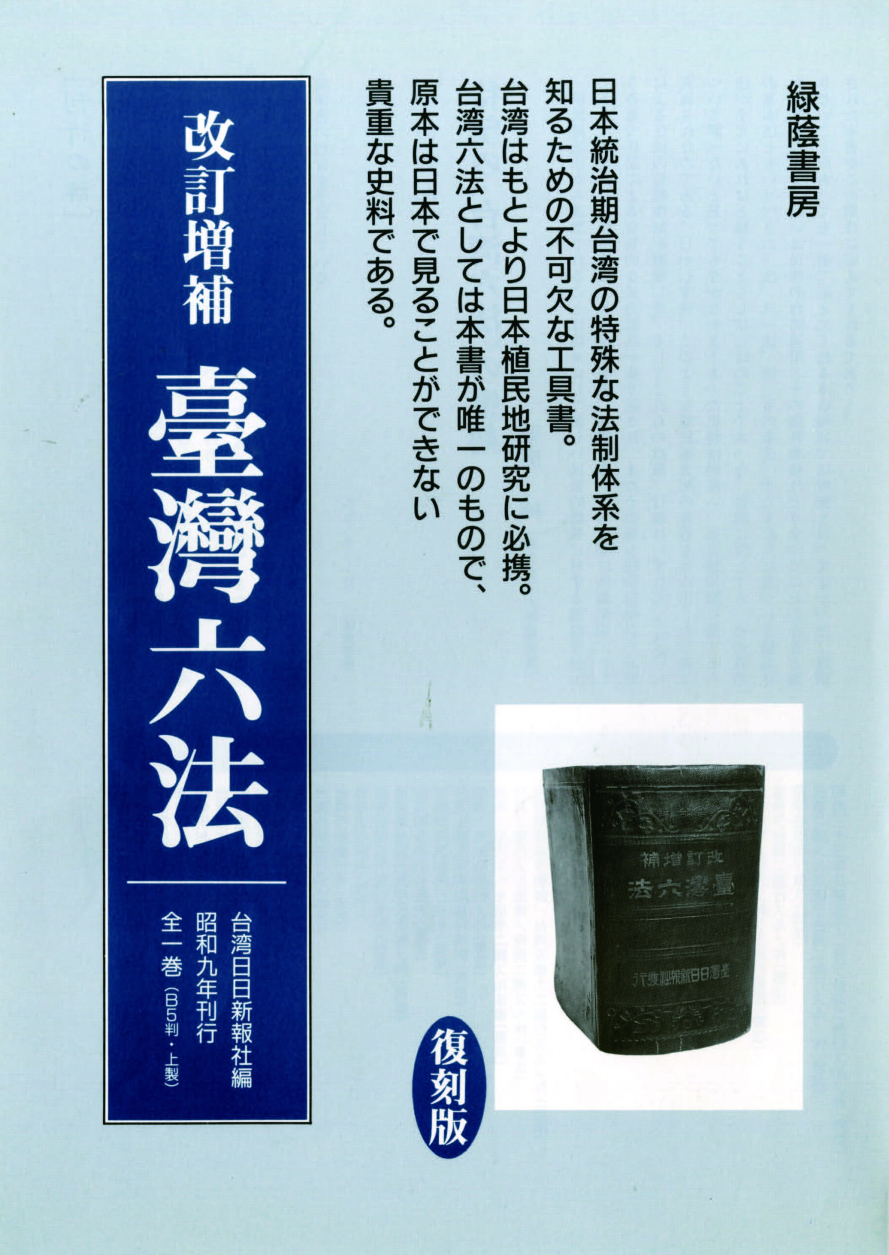 日本統治期台湾の特殊な法制体系を知るための不可欠な文献。台湾はもとより日本植民地研究に必備。台湾六法としては、本書が唯一のもので、原本は日本で見ることのできない貴重な資料。