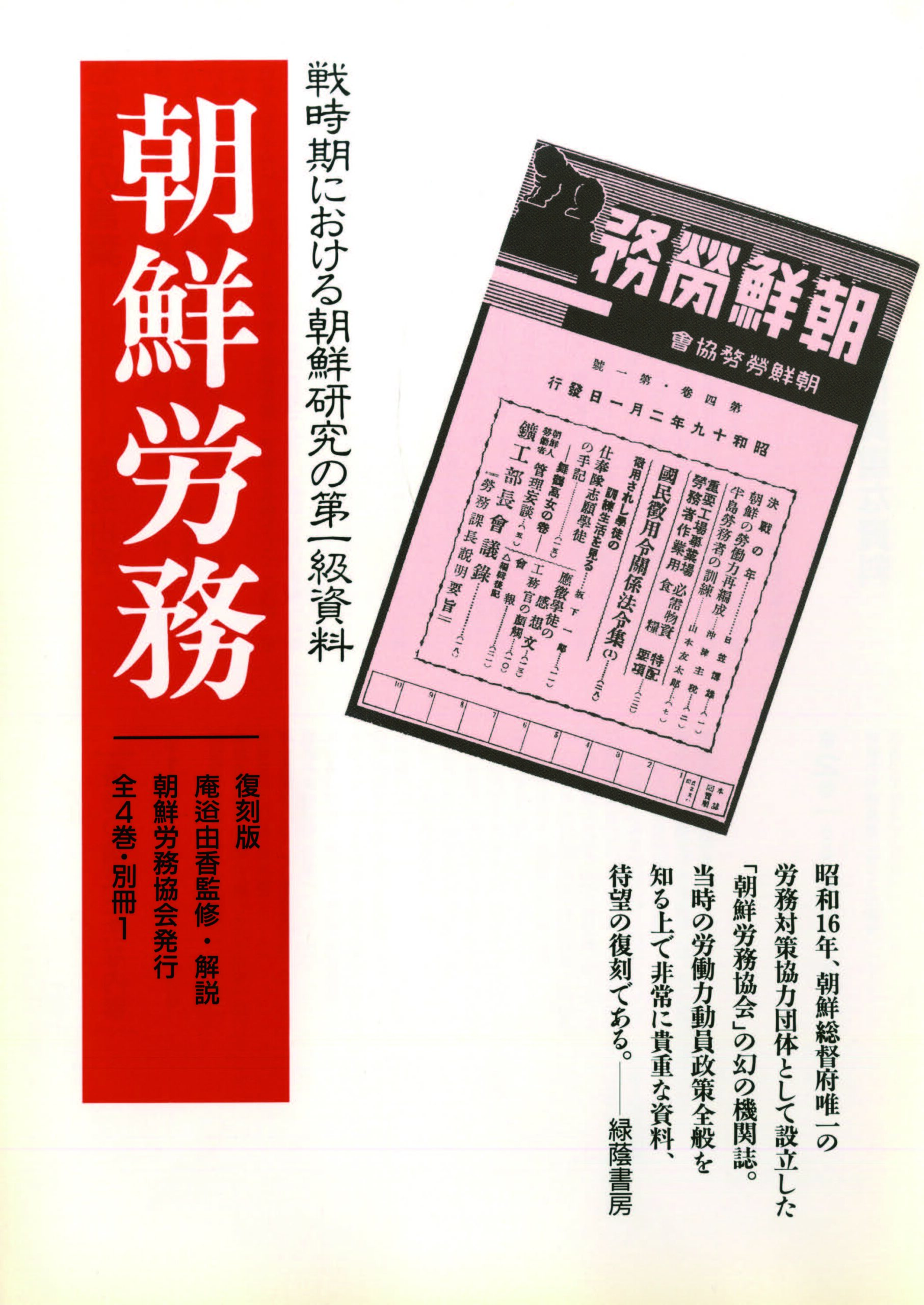 昭和16年、朝鮮総督府の労務対策協力団体として設立した「朝鮮労務協会」の幻の機関誌。戦時下朝鮮の労働力動員政策の推進に大きな役割を担った。植民地末期の史実解明に貴重な第一級史料。